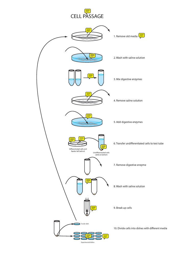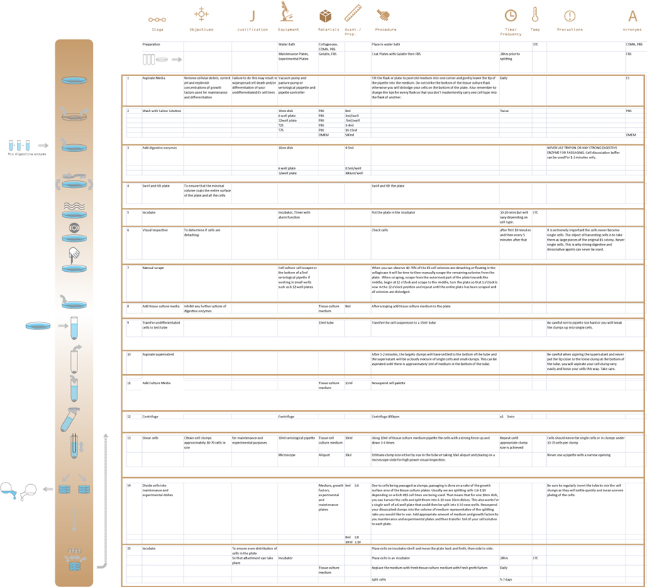 The design team developed a series of visual representations of stem cell research laboratory protocols, first to test their comprehension of these protocols and second to establish a visual language that would effectively communicate these protocols in a manner that was both understandable and well-received by the laboratory staff.