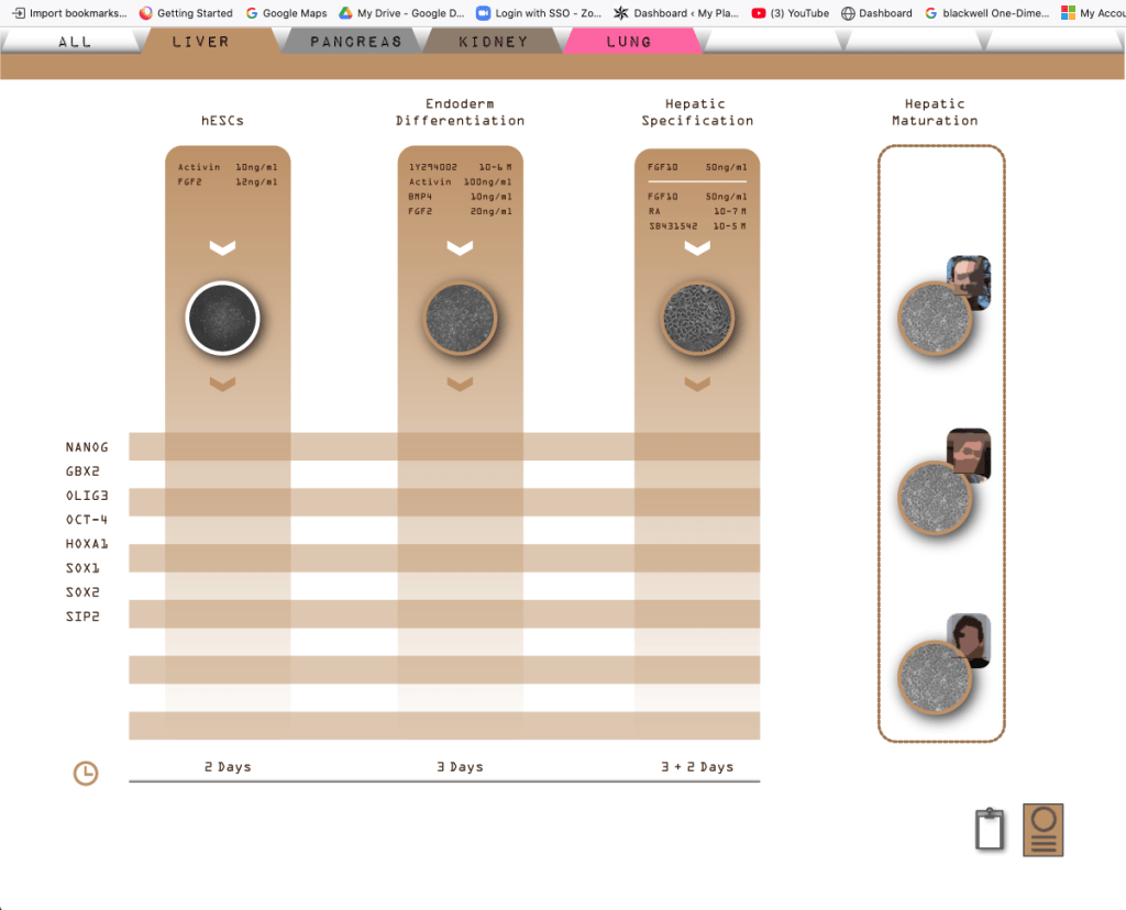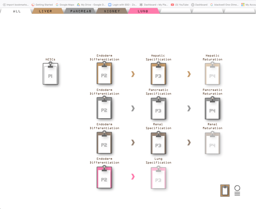 The design team developed an interactive visual system anchored by a diagram illustrating the various stages of stem cell differentiation. This diagram was the foundation for accessing protocol templates and displaying associated “protocol matrices” within a protocol assets library. The designers crafted the user architecture of their interactive system through wireframes, and the tool was realised as a web page. This allowed scientists to access it offline and online, recording, editing, and sharing experiments with colleagues.